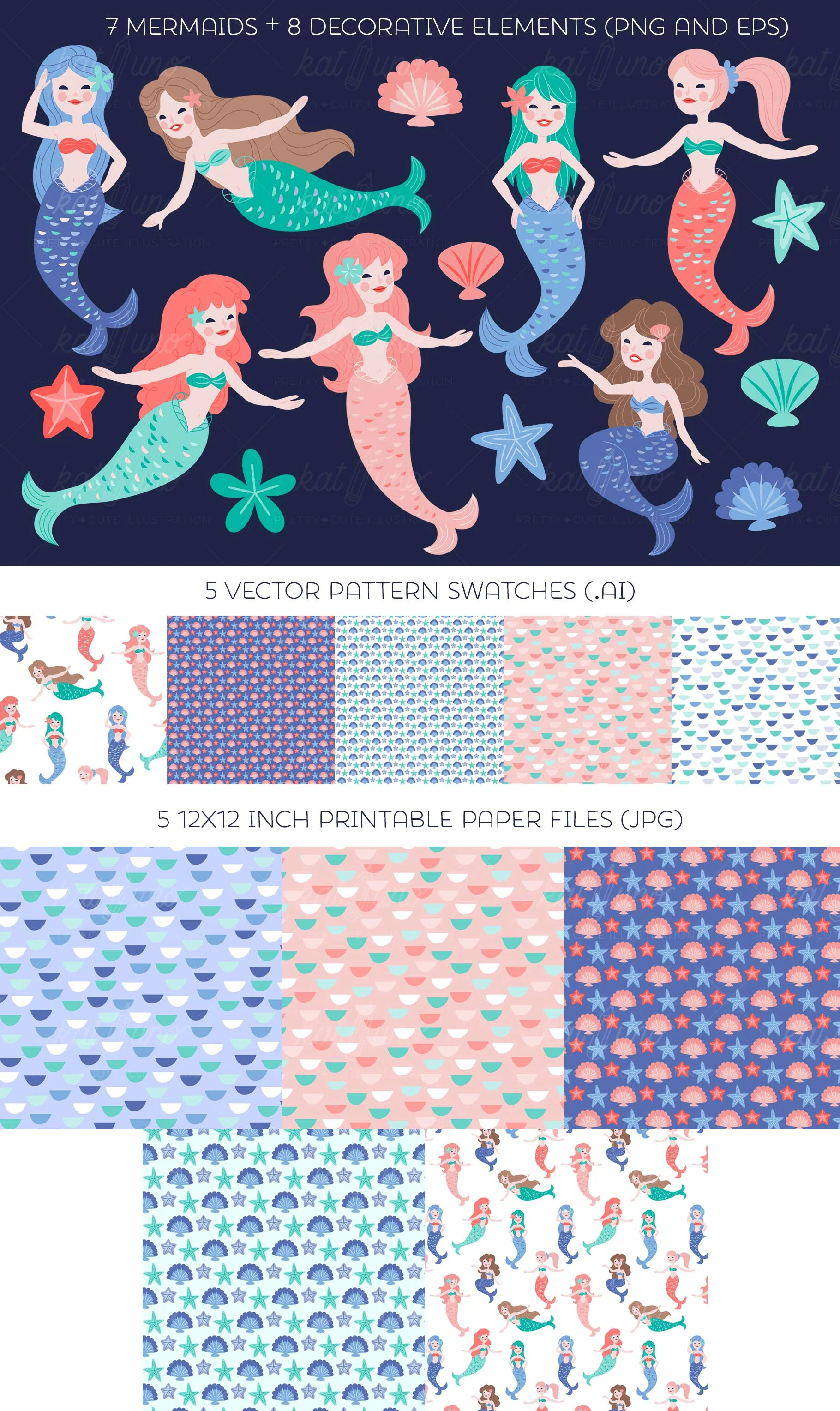 This is the first clip art set that I’m making vector files available! This set contains 15 clip art and includes 7 pretty mermaids along with 8 shells/star fish. The set is provided in .eps and .ai (CS) formats, one file each and separate .png files with transparent backgrounds. The png files range in size from 1.5"x1.5" up to about 5"x8" at 300 dpi.